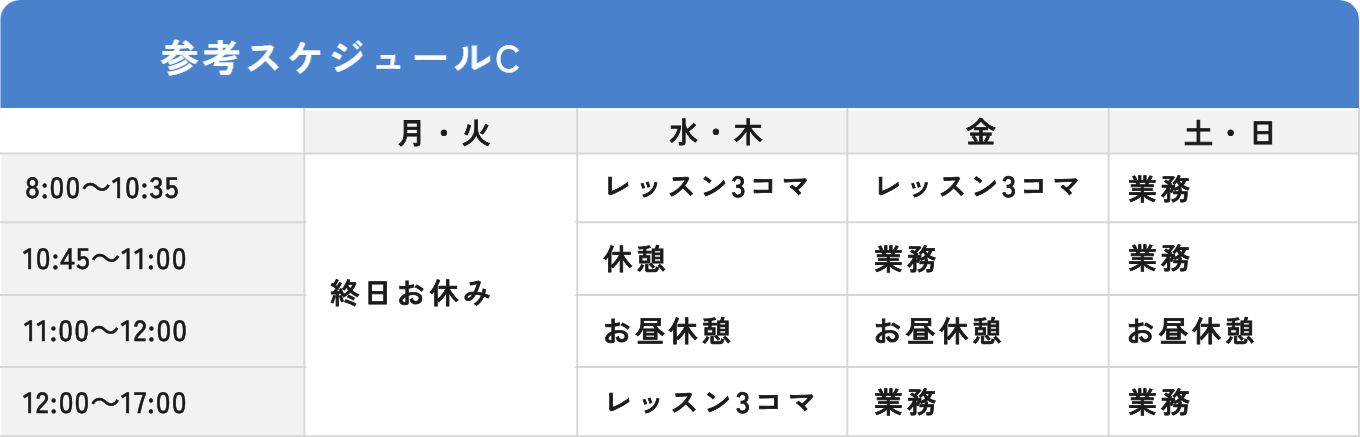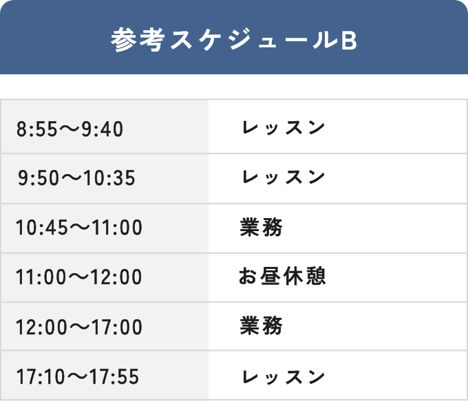 参考スケジュール2. 平日2日休み+平日2日6コマレッスン+土日に終日業務